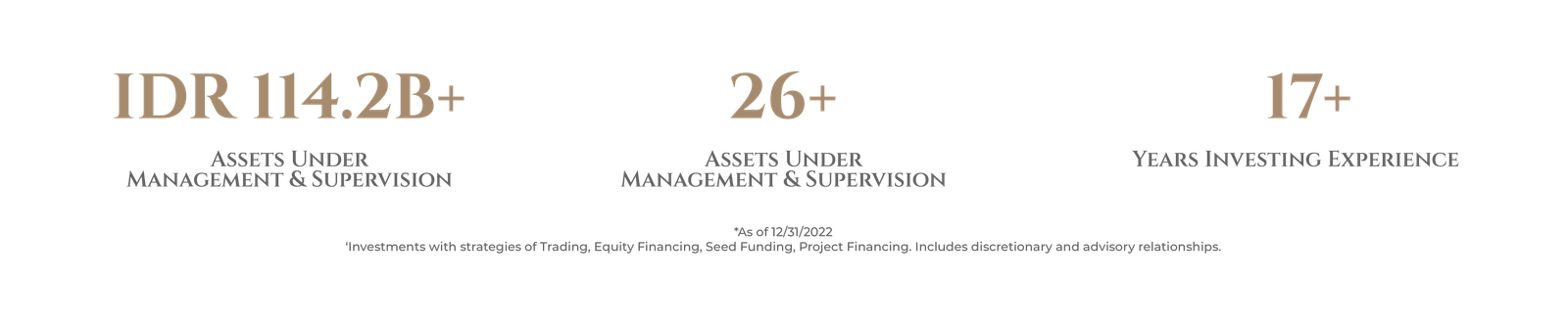 IDR 114.2B+ Assets Under Management & Supervision 26+ General Partners With Whom We Actively Invest’ 17+ Years Investing Experience *As of 12/31/2022 ‘Investments with strategies of Trading, Equity Financing, Seed Funding, Project Financing. Includes discretionary and advisory relationships.